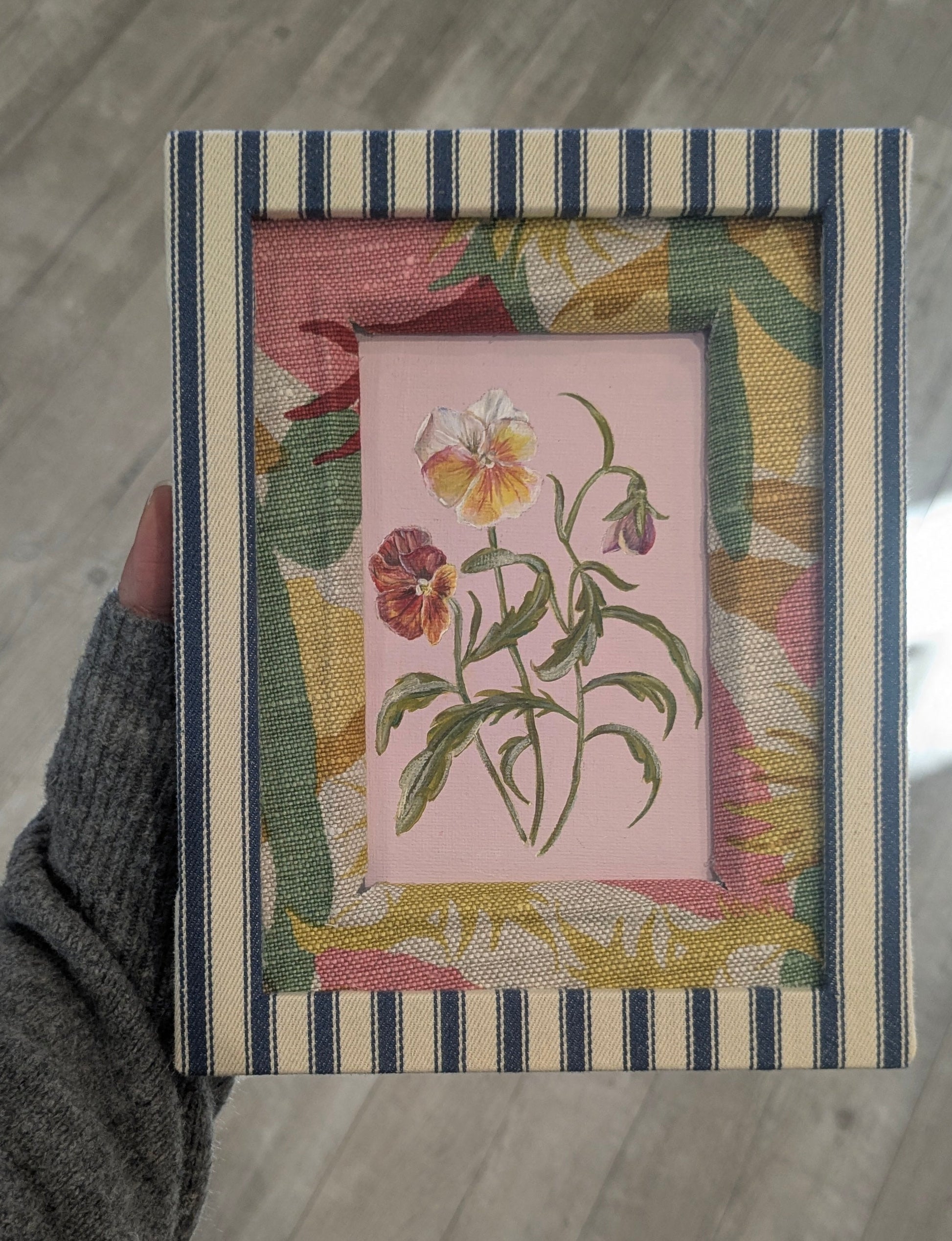 Original Pansy Painting in Custom Frame Wrapped with Christopher Farr “Cactus Flower” Fabric and Navy Ticking Stripe Trim